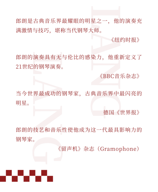 郎朗是享誉世界的钢琴家,他的唱片销量在全球雄踞众多古典音乐榜首位,并同时在主流乐界获得巨大的成功,曾被《时代》杂志选为年度百位全球最具影响力人物之一。一直以来,郎朗与世界一流管弦乐团和指挥家合作,为古典乐迷带来优秀的表演,他的音乐会在全球众多城市售罄。由于郎朗对社会、文化及古典音乐方面的宝贵贡献,七大世界顶尖院校为他颁发了荣誉博士学位。他曾在2008年北京奥运会、2010年广州亚运会、2014年仁川亚运会开幕式和里约热内卢世界杯决赛庆典上演奏,分别在上海和迪拜世博会开幕式担任演出嘉宾,八次登上央视春晚的舞台,并四次在格莱美颁奖礼中与金属乐队Metallica、法瑞尔·威廉姆斯和赫比·汉考克等艺术家合作,通过电视等大众媒体将美好的音乐带给更广泛的观众。