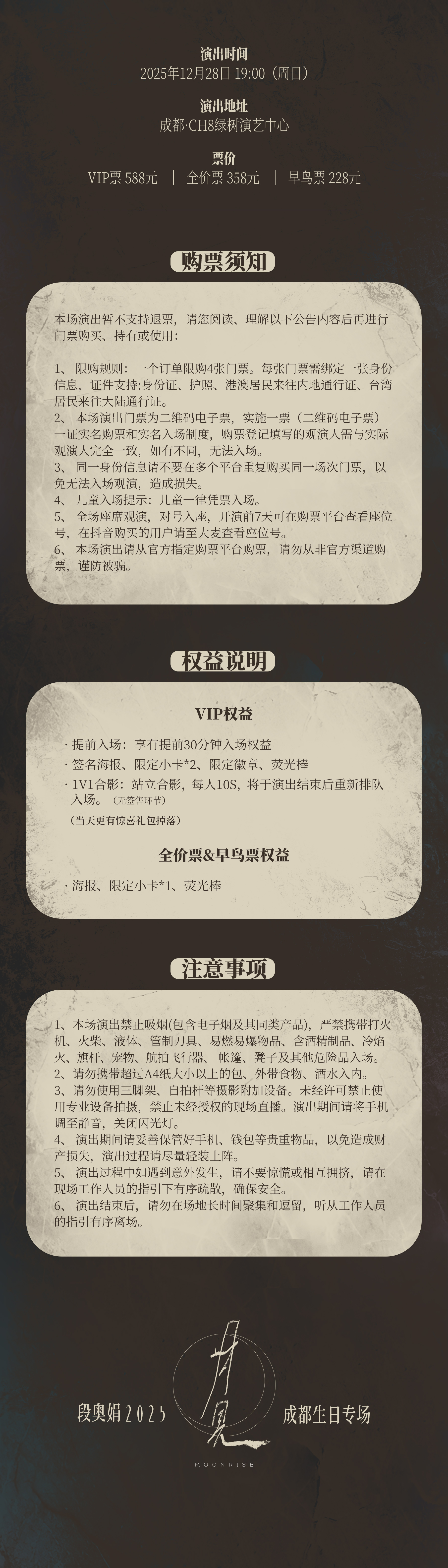 购买前请提前规划好行程,当天确保至少提前一小时到达现场,以免影响您正常观演,感谢您的理解与配合。