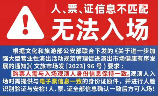 实名制演出请勿用同一“实名观演人信息”在多家购票平台重复下单,由该行为产生的退票手续费/不可退票/无法入场等所有损失,由购票人承担。