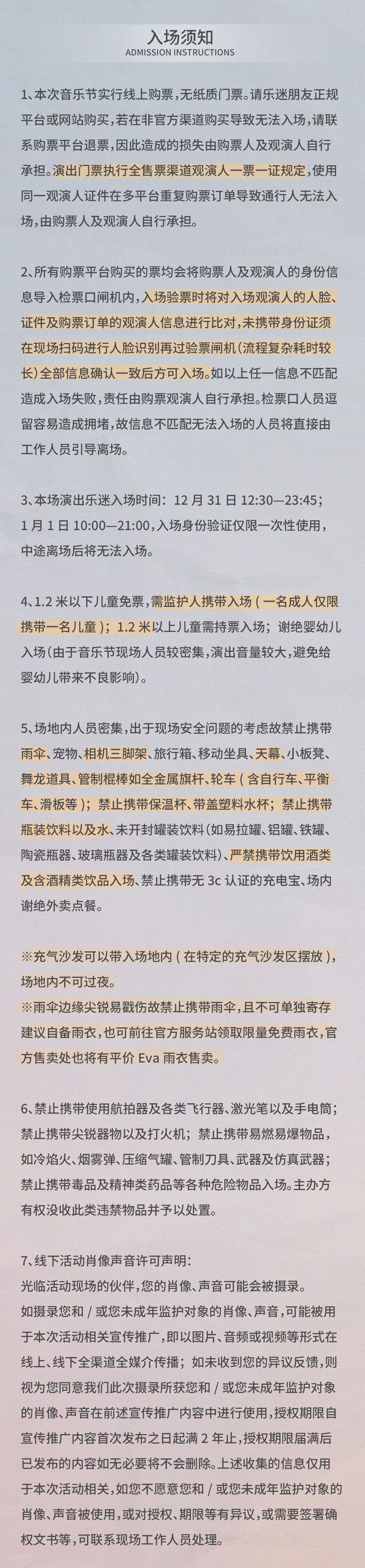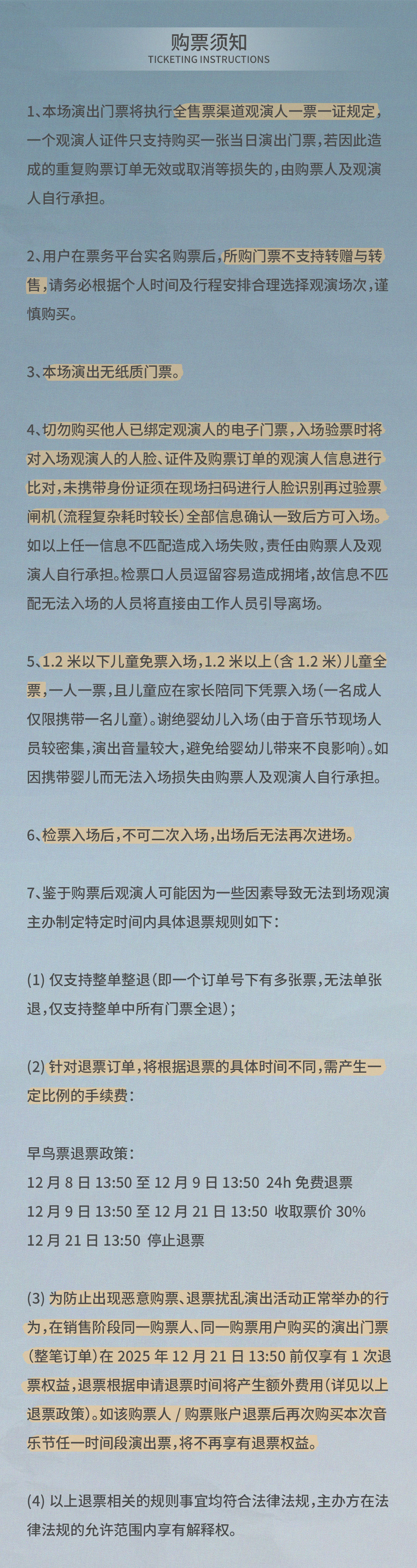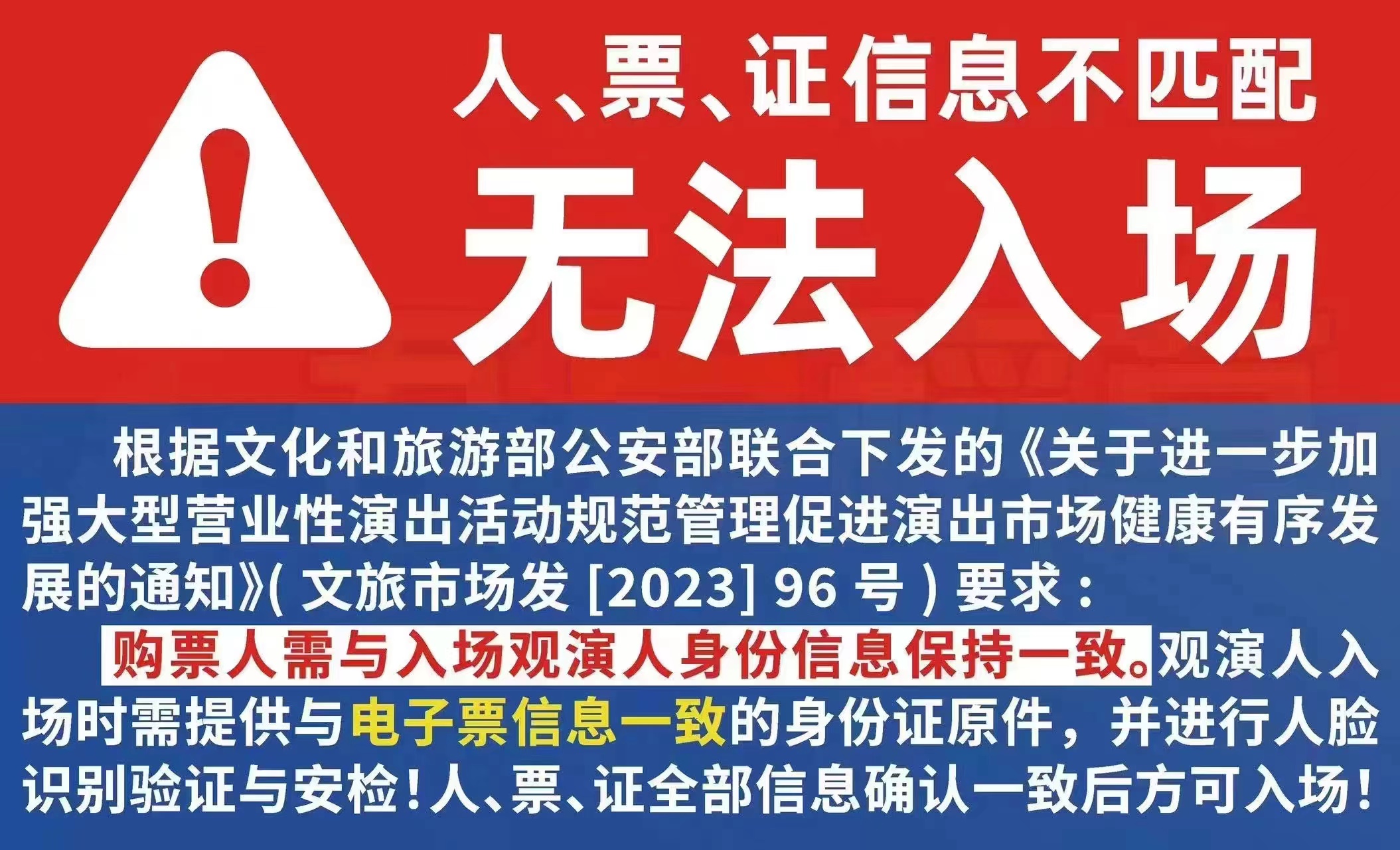 实名制演出请勿用同一“实名观演人信息”在多家购票平台重复下单,由该行为产生的退票手续费/不可退票/无法入场等所有损失,由购票人承担。