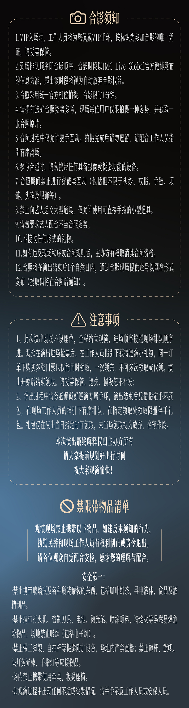 购买前请提前规划好行程,当天确保至少提前一小时到达现场,以免影响您正常观演,感谢您的理解与配合。