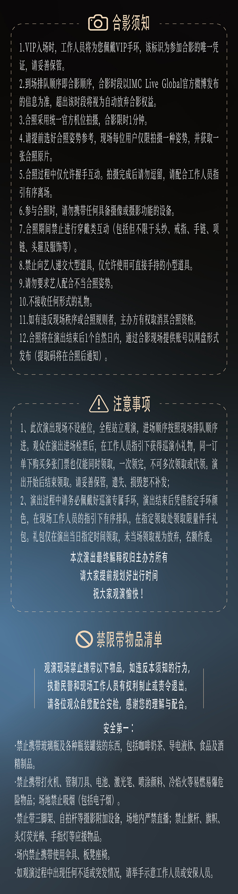 购买前请提前规划好行程,当天确保至少提前一小时到达现场,以免影响您正常观演,感谢您的理解与配合。