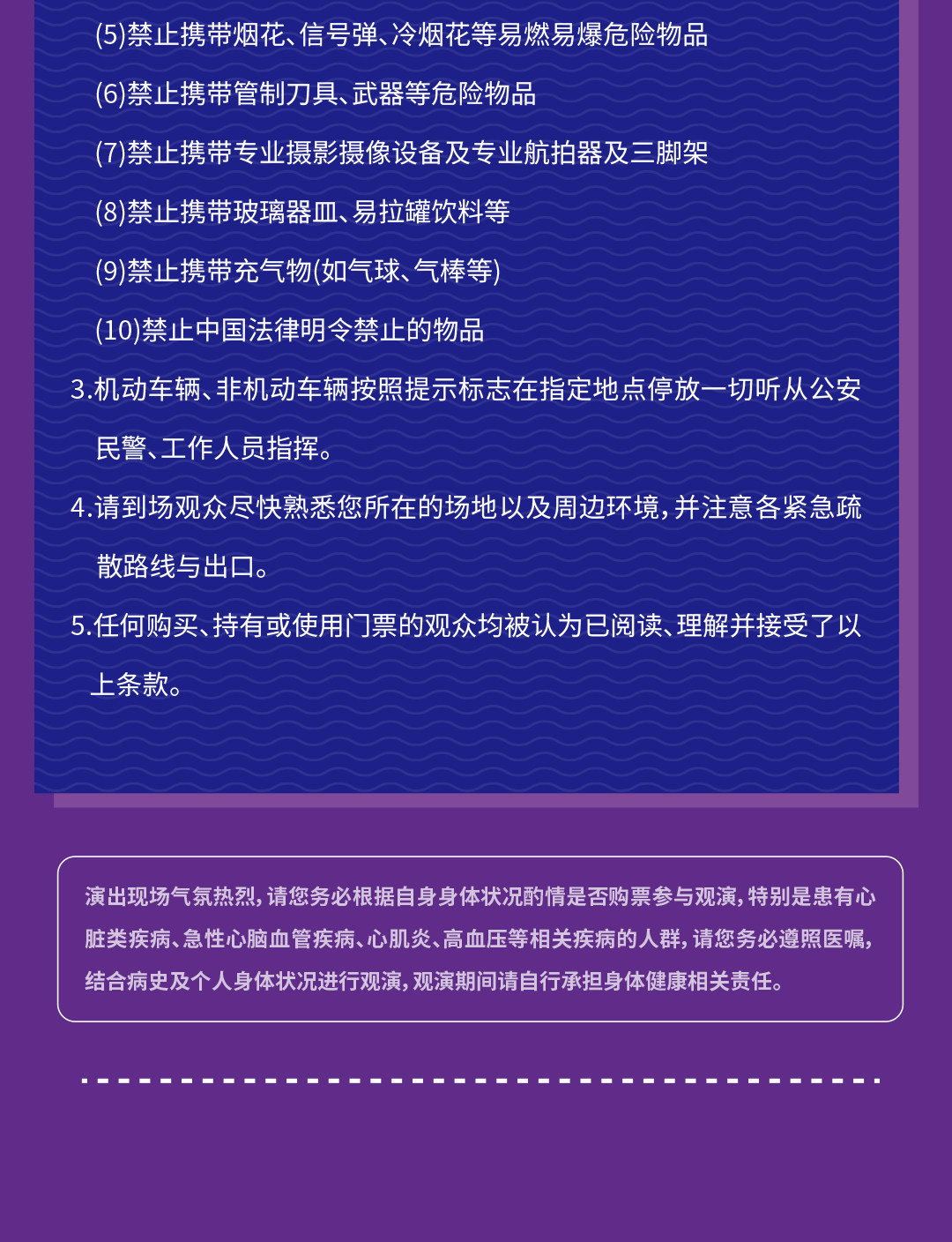 实名制演出请勿用同一“实名观演人信息”在多家购票平台重复下单,由该行为产生的退票手续费/不可退票/无法入场等所有损失,由购票人承担。