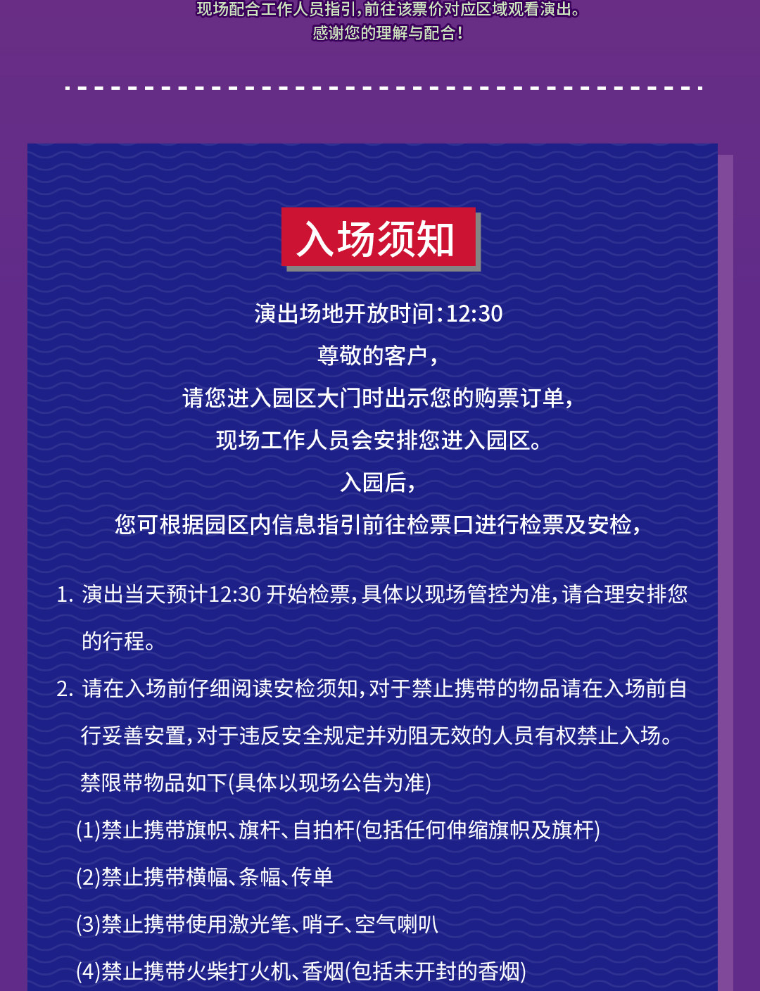 除不可抗力因素导致演出赛事取消外,门票不支持退换!非实名制门票可在平台转售(实名制演出赛事不可转票)。