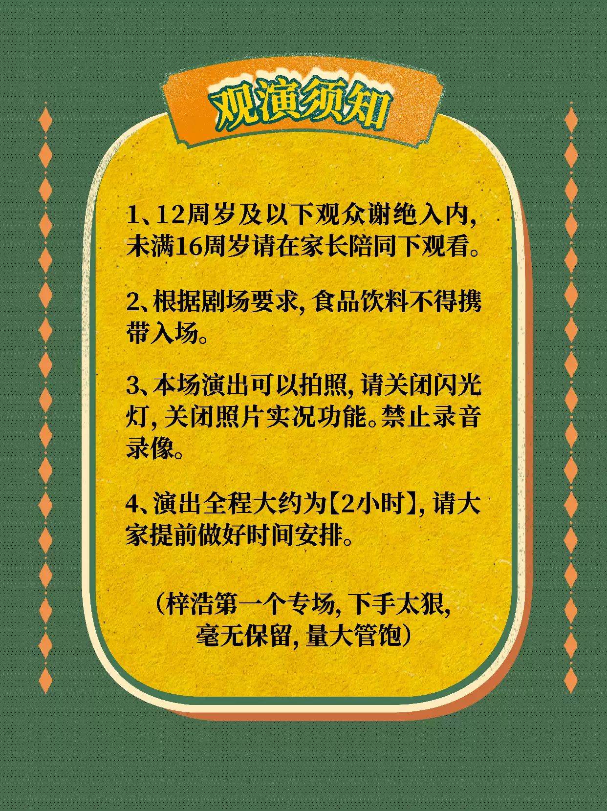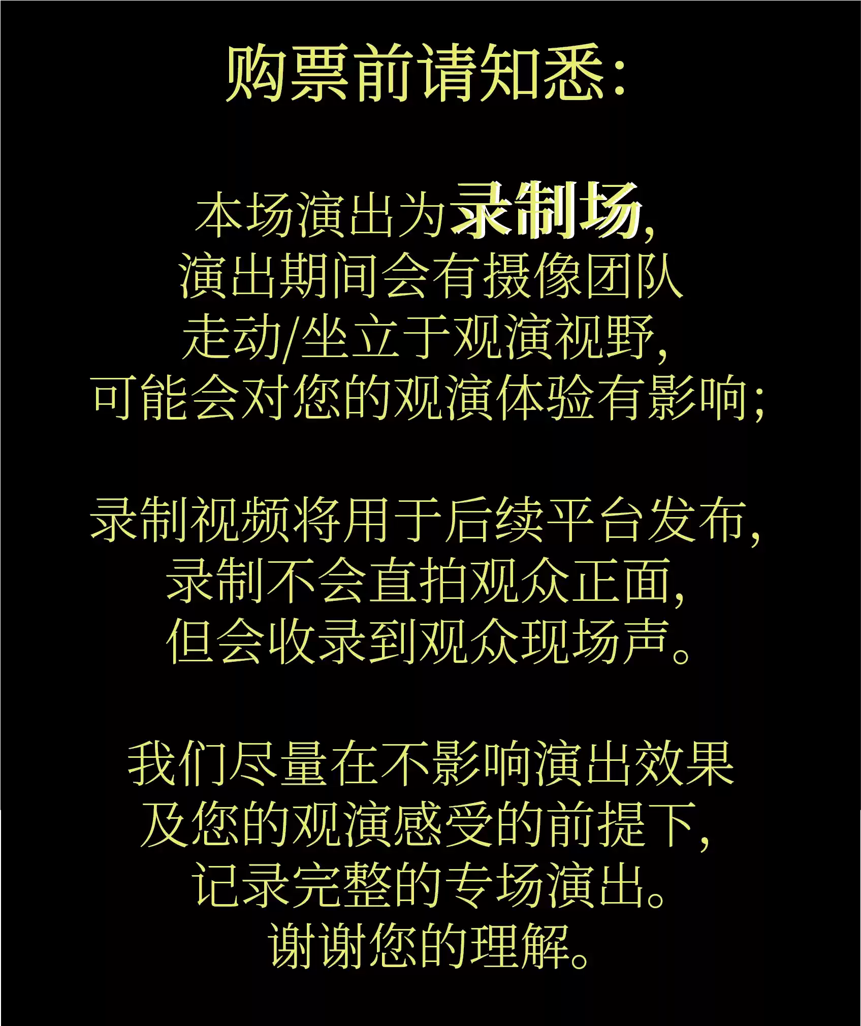 实名制演出请勿用同一“实名观演人信息”在多家购票平台重复下单,由该行为产生的退票手续费/不可退票/无法入场等所有损失,由购票人承担。