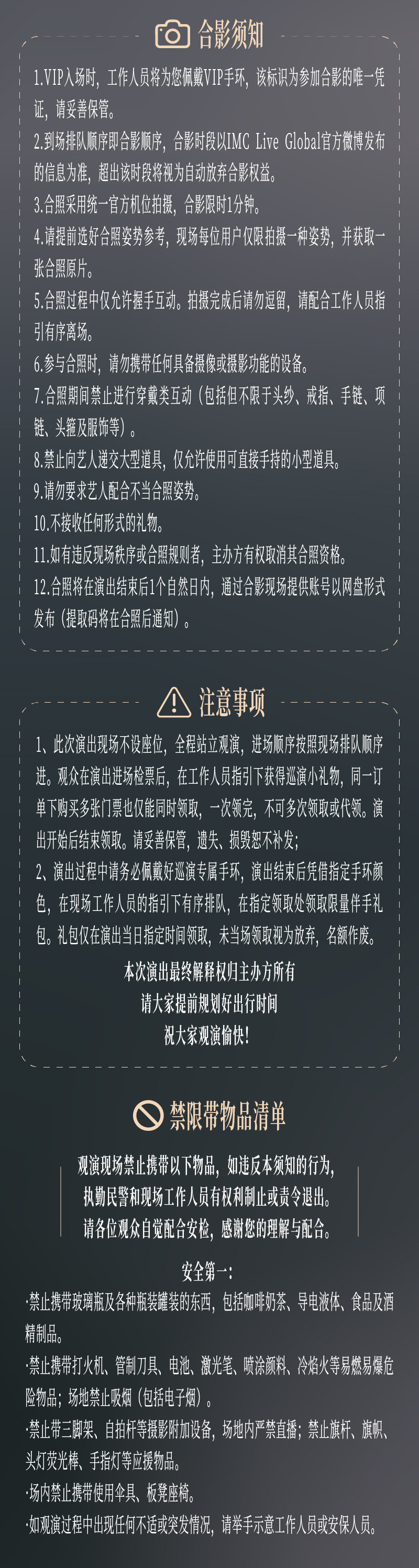 实名制演出请勿用同一“实名观演人信息”在多家购票平台重复下单,由该行为产生的退票手续费/不可退票/无法入场等所有损失,由购票人承担。