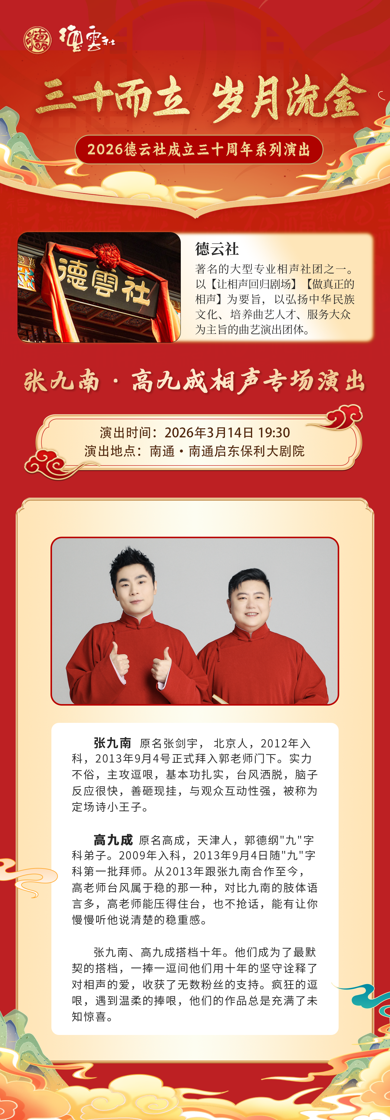 【南通】“三十而立 岁月流金”2026德云社成立三十周年系列演出之张九南·高九成相声专场演出-南通站
